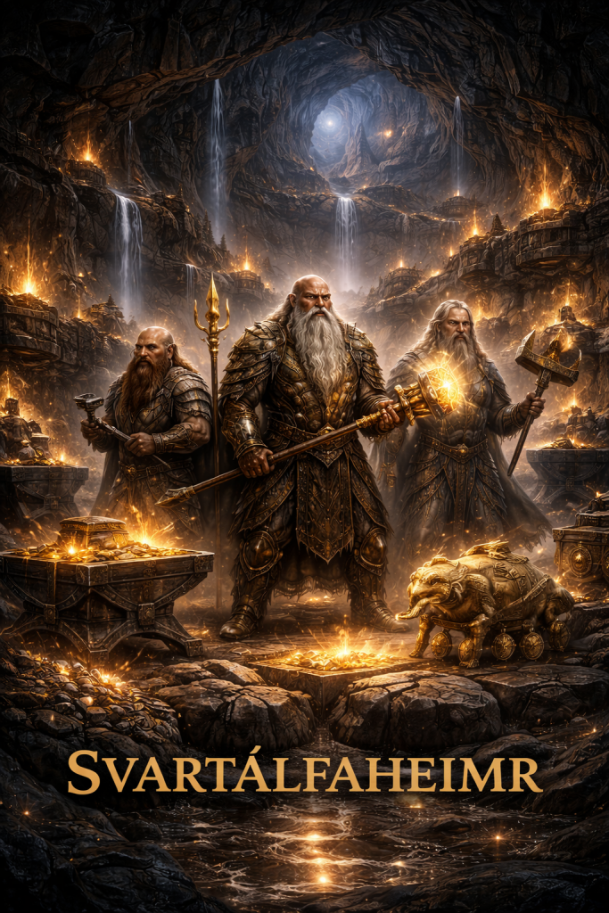 Svartálfaheimr / Niðavellir is the deep realm where power is forged — a place of brilliance, wisdom, and danger, where creation and ruin are born from the same hands.