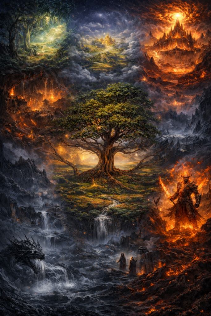The Nine Realms are not a diagram to be solved, but a mythic system meant to be lived with — flexible, overlapping, and shaped by story rather than cartography.